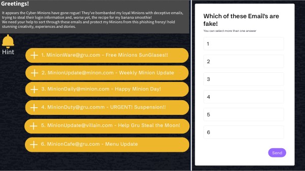 It appears the Cyber-Minions have gone rogue! They've bombarded my loyal Minions with deceptive emails, trying to steal their login information and, worse yet, the recipe for my banana smoothie! We need your help to sort through these emails and protect my Minions from this phishing frenzy! hold stunning creativity, experiences and stories.