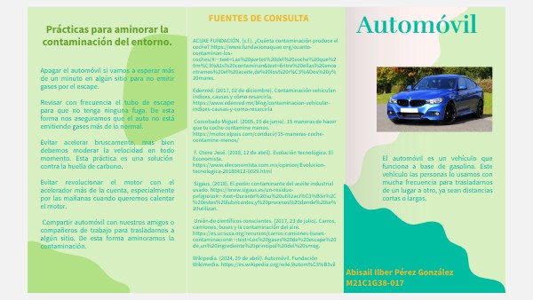 ACUAE FUNDACIÓN. (s.f.). ¿Cuánta contaminación produce el coche? https://www.fundacionaquae.org/cuanto-contaminan-los-coches/#:~:text=Las%20partes%20del%20coche%20que%20m%C3%A1s%20contaminan&text=Entre%20ellas%20encontramos%20el%20aceite,de%20los%20r%C3%ADos%20y%20mares. Edenred. (2017, 02 de diciembre). Contaminación vehicular: índices, causas y cómo resarcirla. https://www.edenred.mx/blog/contaminacion-vehicular-indices-causas-y-como-resarcirla Corcobado Miguel. (2005, 19 de junio). 15 maneras de hacer que tu coche contamine menos. https://motor.elpais.com/conducir/15-maneras-coche-contamine-menos/ F. Otero José. (2018, 12 de abril). Evolución tecnológica. El Economista. https://www.eleconomista.com.mx/opinion/Evolucion-tecnologica-20180412-0029.html Sigaus. (2018). El poder contaminante del aceite industrial usado. https://www.sigaus.es/un-residuo-peligroso#:~:text=Durante%20su%20utilizaci%C3%B3n%2C%20estos%20lubricantes,y%20procesos%20donde%20se%20utilizan. Unión de científicos conscientes. (2017, 23 de julio). Carros, camiones, buses y la contaminación del aire. https://es.ucsusa.org/recursos/carros-camiones-buses-contaminacion#:~:text=Los%20gases%20de%20escape%20de,un%20ingrediente%20principal%20del%20smog. Wikipedia. (2024, 29 de abril). Automóvil. Fundación Wikimedia. https://es.wikipedia.org/wiki/Autom%C3%B3vil