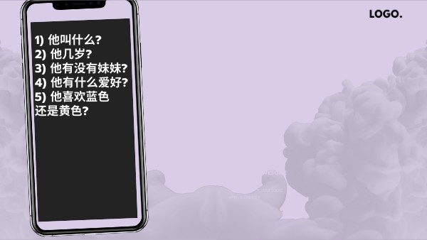 1) 他叫什么? 2) 他几岁? 3) 他有没有妹妹? 4) 他有什么爱好? 5) 他喜欢蓝色 还是黄色?
