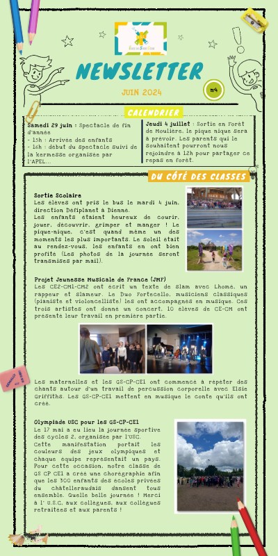 Samedi 29 juin : Spectacle de fin d'année - 15h : Arrivée des enfants - 16h : début du spectacle suivi de la kermesse organisée par l'APEL...