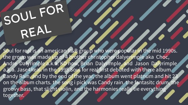 Soul for real is an american R&B group who were popular in the mid 1990s. the group was made up of 4 brother christopher dalyerimple aka Choc, Andre Dalyrimple a.k.a. KD now, Brian Dalyrimple, and Jason Dalyrimple a.k.a. Jase4Real. in the 1995 Soul for real first debuted with there album Candy Rain, and by the end of the year, the album went platnum and hit 23 on the album charts. the song i pick was Candy rain. the fantasitc drum, the groovy bass, that slight violin, and the harmonies really tie everything together.