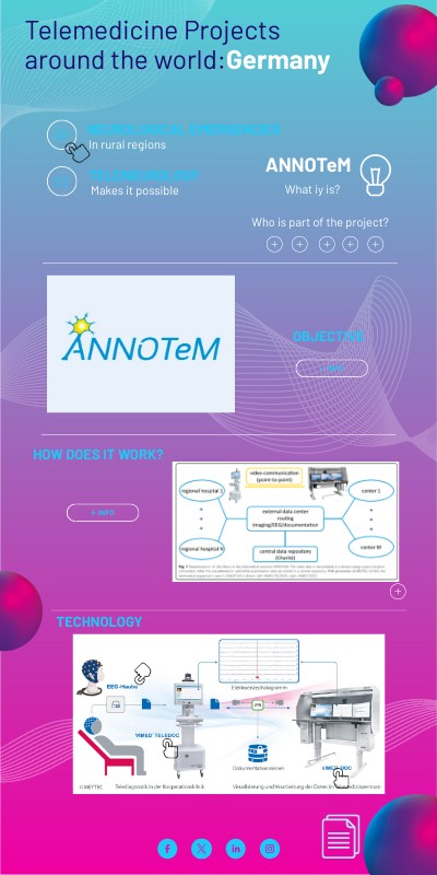 1. Weber JE, Angermaier A, Bollweg K, Erdur H, Ernst S, Flöel A, et al. Acute neurological care in north-east Germany with telemedicine support (ANNOTeM): protocol of a multi-center, controlled, open-label, two-arm intervention study. BMC Health Serv Res [Internet]. 2020;20(1). Disponible en: http://dx.doi.org/10.1186/s12913-020-05576-w 2. v. AN b. Showcase: The ANNOTem project Using teleneurology and dry EEG to improve neurological care [Internet]. Ant-neuro.com. [citado el 19 de mayo de 2024]. Disponible en: https://www.ant-neuro.com/sites/default/files/files/UDO-SM-0315%20rev01%20waveguard%20touch%20showcase%20ANNOTeM_3.pdf 3. ANNOTeM – Akut-Neurologische Versorgung in Nord- Ost-Deutschland mit TeleMedizinischer Unterstützung [Internet]. G-ba.de. [citado el 19 de mayo de 2024]. Disponible en: https://innovationsfonds.g-ba.de/projekte/neue-versorgungsformen/annotem-akut-neurologische-versorgung-in-nord-ost-deutschland-mit-telemedizinischer-unterstuetzung.76 4. Berlin C–. U. ANNOTeM [Internet]. Charite.de. [citado el 19 de mayo de 2024]. Disponible en: https://www.charite.de/en/research/charite_research/research_projects_and_programs/innovation_fund/annotem/ 5. ANNOTeM – Akutneurologische Versorgung in Nordostdeutschland mit telemedizinischer Unterstützung [Internet]. Annotem.de. [citado el 19 de mayo de 2024]. Disponible en: https://www.annotem.de/ 6. ANNOTeM [Internet]. Meytec.de. [citado el 19 de mayo de 2024]. Disponible en: https://meytec.de/annotem-netzwerk/