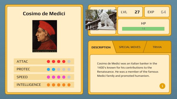 Cosimo de Medici was an italian banker in the 1400's known for his contributions to the Renaissance. He was a member of the famous Medici family and promoted humanism.