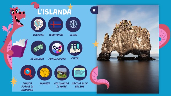 L'Islanda è la seconda isola piu grande d'Europa. Ha un territorio montuoso, 200 vulcani di cui 30 attivi e numerosi ghiacciai. La bandiera è una croce scandinava e ha il rosso dei vulcani, il blu del mare ed il bianco dei ghiacciai.