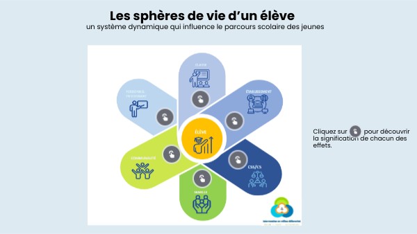 L'élève évolue dans de nombreuses sphères qui peuvent venir influencer sa persévérance et sa réussite scolaires. C'est pourquoi il est important de tenir compte de ces sphères, puisqu'elles viennent appuyer les multiples dimensions de l'élèves: affectives, morales, intellectuelles, physiques et spirituelles.