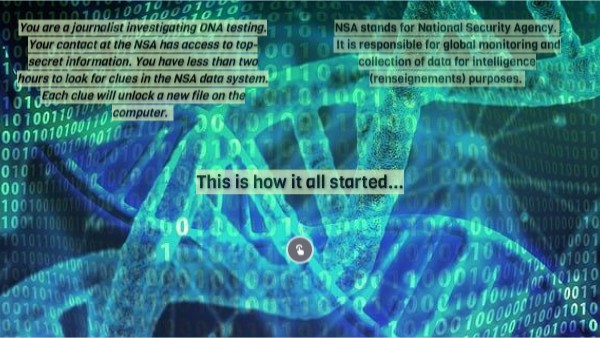 You are a journalist investigating DNA testing. Your contact at the NSA has access to top-secret information. You have less than two hours to look for clues in the NSA data system. Each clue will unlock a new file on the computer.
