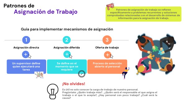 Patrones de asignación de trabajo se refieren específicamente a problemas recurrentes y soluciones comprobadas relacionadas con el desarrollo de sistemas de información para la asignación de trabajo.