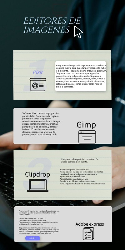 Programa online gratuito o premium. Se puede usar con cuenta para guardar proyectos en la nube o sin ella Elimina fondos. * Cambia el tamaño de la imagen. * Convierte las imágenes a GIF o MP4. * Crear carteles, folletos, logos, publicidad para redes sociales, currículos o invitaciones Se pueden usar plantillas, colocar fondos o colocar filtros,texto, fondos o elementos como stickers o figuras tiene la herramienta recorte, quitarse puede mejorar el contraste, brillo, nitidez, saturación, etcétera