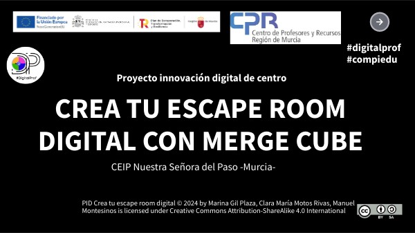 Este juego de escape ha sido elaborado por las alumnas y alumnos de 5.º de Ed. Primaria del CEIP Nª Sª del Paso de La Ñora, Murcia, con la guía de su tutora Marina Gil, y los profes Clara y Manuel. Para poder realizar este juego necesitarás un Merge Cube, un dispositivo para proyectar las pruebas y una tablet con la aplicación Merge Object Viewer