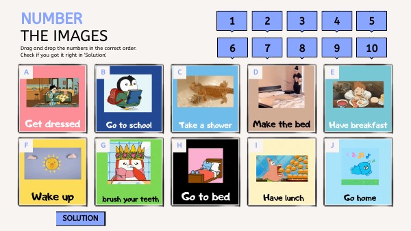 Drag and drop the numbers in the correct order.Check if you got it right in 'Solution'.
