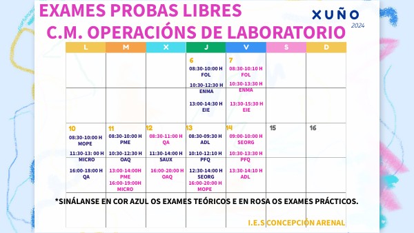 *SINÁLANSE EN COR AZUL OS EXAMES TEÓRICOS E EN ROSA OS EXAMES PRÁCTICOS.