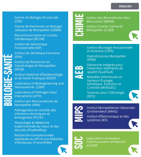 Centre de Biologie Structurale (CBS) Centre de Recherche en Biologie cellulaire de Montpellier (CRBM) Biocommunication en Cardio-métabolique (BC2M) Institut de Génomique Fonctionnelle (IGF) Institut de Génétique Humaine (IGH) Institut de Recherche en Cancérologie de Montpellier (IRCM) Institut Desbrest d’Épidémiologie et de Santé Publique (IDESP) Laboratory of Bioengineering and Nanosciences (LBN) Laboratory of Pathogen Host Interactions (LPHI) Institut des Neurosciences de Montpellier (INM) Pathogenèse et contrôle des infections chroniques et émergentes (PCCEI) Physiologie & Médecine expérimentale du Cœur et des Muscles (PhyMedExp) Recherche translationnelle appliquée au VIH et aux Maladies Infectieuses (TransVIHMI)
