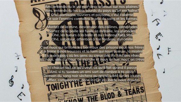 Ami, entends-tu le vol noir des corbeaux sur nos plaines Ami, entends-tu les cris sourds du pays qu'on enchaîne Ohé, partisans, ouvriers et paysans, c'est l'alarme Ce soir l'ennemi connaîtra le prix du sang et des larmes