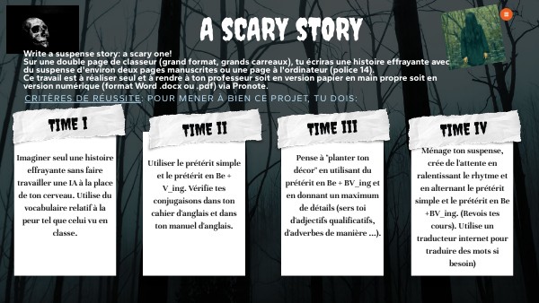Write a suspense story: a scary one! Sur une double page de classeur (grand format, grands carreaux), tu écriras une histoire effrayante avec du suspense d'environ deux pages manuscrites ou une page à l'ordinateur (police 14). Ce travail est à réaliser seul et à rendre à ton professeur soit en version papier en main propre soit en version numérique (format Word .docx ou .pdf) via Pronote.