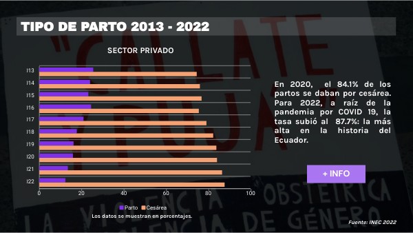 En 2020, el 84.1% de los partos se daban por cesárea. Para 2022, a raíz de la pandemia por COVID 19, la tasa subió al 87.7%: la más alta en la historia del Ecuador.