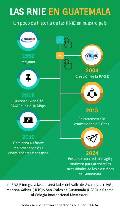 A raíz que se lanza la Red Clara a nivel latinoamericano, se crea la Red Avanzada Guatemalteca para la Investigación y Educación (RAGIE). La conectividad inicial era de 4 Mbps