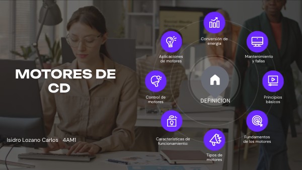 Los motores de corriente continua (CD) son dispositivos electromecánicos que convierten energía eléctrica en energía mecánica utilizando corriente continua. Funcionan mediante la interacción de un campo magnético generado por el estator (parte fija) y un campo magnético generado por el rotor (parte móvil) alimentado por la corriente. La conmutación de la corriente en el rotor se realiza mediante un conmutador y escobillas, permitiendo el movimiento continuo del motor. Son apreciados por su control preciso de velocidad y par, siendo comunes en aplicaciones como vehículos eléctricos, maquinaria industrial y sistemas de automatización.