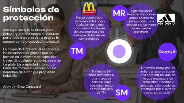 Son aquellos que se utilizar para indicar que dicha marca o producto pertenece a un creador, a esto se le conoce como propiedad intelectual. La propiedad intelectual se refiere a las creaciones originales que se forman en la mente y se expresan a través de cualquier soporte, sea o no tangible. La propiedad intelectual tiene dos formas de expresión: los derechos de autor y la propiedad industrial