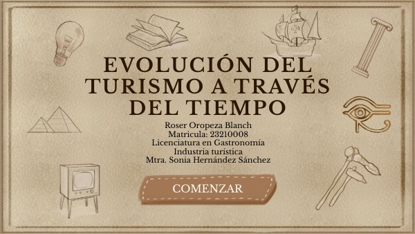 Martinez, E. (2022, August 19). La historia del turismo: 15 sucesos importantes. Entorno Turístico; Entorno Turístico. https://www.entornoturistico.com/los-15-sucesos-que-modificaron-la-historia-del-turismo/#La_creacion_de_carreteras https://www.timetoast.com/users/2798793. (1600). Timetoast. Timetoast Timelines; Timetoast. https://www.timetoast.com/timelines/momentos-mas-importantes-de-la-historia-del-turismo Media Vuelta Digital. (2020, August 5). Origen, Historia y Antecedentes del Turismo - Media Vuelta Digital. Media Vuelta Digital. https://mediavueltadigital.com/historia-del-turismo/