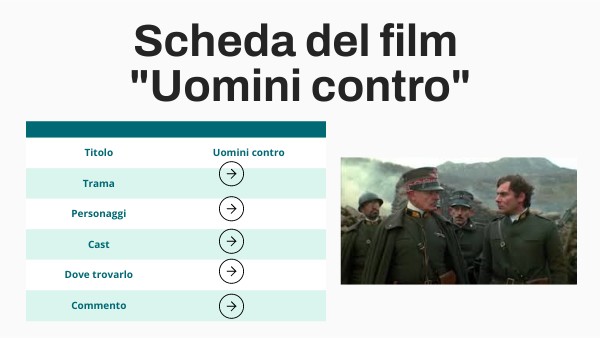Il film "Uomini contro" è molto particolare, dato che è strutturato come un documentario ma senza una narrazione, il film è infatti centrato sulla vita dei soldati in trincea, e non sulla geostoria della prima guerra mondiale come altri film. L'ho trovato molto interessante e soprattutto istruttivo, nei film la guerra viene sempre mostrata e vista come un qualcosa di epico, un'avventura che ti porta a diventare un eroe. Osservando con attenzione il film possiamo invece notare come la vita in trincea fosse molto dura e possiamo anche notare come nessun soldato apprezzi la sua condizione. Uno dei messaggi più importanti è la crudeltà dei generali che vedevano i soldati come pedine da mandare al macello per "una causa più grande" e si può notare come una mancanza di rispetto veniva punita con la morte anche se la disobbedienza poteva comportare la salvezza di centinaia di soldati e talvolta il successo della missione Il film mi è piaciuto molto e lo consiglio.