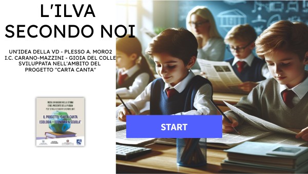 Questa idea nasce dalle letture che abbiamo fatto in classe per il progetto "Carta Canta". Abbiamo letto tanti articoli su La Gazzetta del Mezzogiorno, soprattutto su temi di Economia e Ecologia, e ci è subito saltato agli occhi il ripetersi della parola ILVA. Allora abbiamo svolto qualche ricerca, per capire bene di cosa si tratta. Abbiamo scoperto che l'Ilva è una grandissima fabbrica che produce acciaio, ma purtroppo inquina tantissimo l'aria, il mare e la terra intorno con le sue emissioni di fumi e polveri tossiche. Sorge a pochi km dal luogo in cui viviamo noi... Tanti bambini e adulti che vivono vicino si sono ammalati di tumori e altre brutte malattie respiratorie. È una cosa terribile! Però l'Ilva dà anche tanto lavoro alla città, quindi è un argomento molto complicato. Allora noi abbiamo pensato di creare un'escape room per spiegare questa situazione in modo coinvolgente e divertente. Chi parteciperà dovrà superare diverse prove per per cercare di "fuggire" e salvare il Mezzogiorno dall'inquinamento dell'Ilva!
