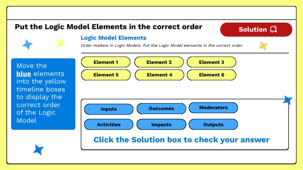 Move the blue elements into the yellow timeline boxes to display the correct order of the Logic Model