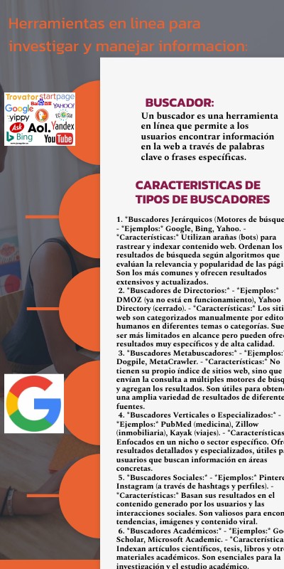 1. *Buscadores Jerárquicos (Motores de búsqueda):* - *Ejemplos:* Google, Bing, Yahoo. - *Características:* Utilizan arañas (bots) para rastrear y indexar contenido web. Ordenan los resultados de búsqueda según algoritmos que evalúan la relevancia y popularidad de las páginas. Son los más comunes y ofrecen resultados extensivos y actualizados. 2. *Buscadores de Directorios:* - *Ejemplos:* DMOZ (ya no está en funcionamiento), Yahoo Directory (cerrado). - *Características:* Los sitios web son categorizados manualmente por editores humanos en diferentes temas o categorías. Suelen ser más limitados en alcance pero pueden ofrecer resultados muy específicos y de alta calidad. 3. *Buscadores Metabuscadores:* - *Ejemplos:* Dogpile, MetaCrawler. - *Características:* No tienen su propio índice de sitios web, sino que envían la consulta a múltiples motores de búsqueda y agregan los resultados. Son útiles para obtener una amplia variedad de resultados de diferentes fuentes. 4. *Buscadores Verticales o Especializados:* - *Ejemplos:* PubMed (medicina), Zillow (inmobiliaria), Kayak (viajes). - *Características:* Enfocados en un nicho o sector específico. Ofrecen resultados detallados y especializados, útiles para usuarios que buscan información en áreas concretas. 5. *Buscadores Sociales:* - *Ejemplos:* Pinterest, Instagram (a través de hashtags y perfiles). - *Características:* Basan sus resultados en el contenido generado por los usuarios y las interacciones sociales. Son valiosos para encontrar tendencias, imágenes y contenido viral. 6. *Buscadores Académicos:* - *Ejemplos:* Google Scholar, Microsoft Academic. - *Características:* Indexan artículos científicos, tesis, libros y otros materiales académicos. Son esenciales para la investigación y el estudio académico.
