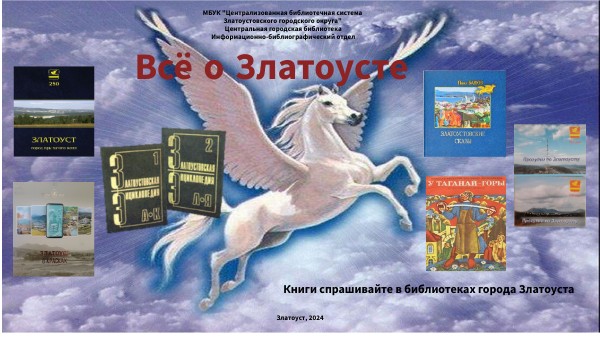 «Златоуст – город крылатого коня»: Эту книгу для всех нас подготовил краевед Александр Вениаминович Козлов. В девяти гранях (или главах) он рассказал о природе, истории, о событиях и людях Златоуста. На каждой страничке ты увидишь рисунки, фотографии, карты или схемы. Обрати внимание на «Златоустовские хроники», в них перечислены все важные события, произошедшие в Златоусте за 250 лет.