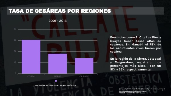 Provincias como El Oro, Los Ríos y Guayas tienen tasas altas de cesáreas. En Manabí, el 78% de los nacimientos vivos fueron por cesárea. En la región de la Sierra, Cotopaxi y Tungurahua, registraron los porcentajes más altos, con un 51% y 55% respectivamente.