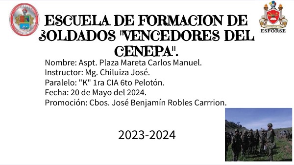 Nombre: Aspt. Plaza Mareta Carlos Manuel. Instructor: Mg. Chiluiza José. Paralelo: "K" 1ra CIA 6to Pelotón. Fecha: 20 de Mayo del 2024. Promoción: Cbos. José Benjamín Robles Carrrion. Materia: Liderazgo.