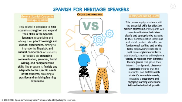 General Spanish Course for Heritage Speakers This course is designed to help students strengthen and expand their skills in the Spanish language, recognizing and valuing their prior knowledge and cultural experiences. Aiming to improve the linguistic and cultural competence of students, it focuses on enhancing communication, grammar, formal writing, and comprehension skills. The program is flexible and adaptable to the specific needs of the students, providing a positive and enriching learning experience.
