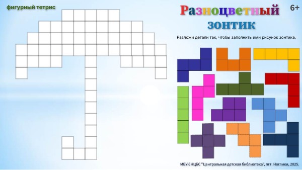 Разложи детали так, чтобы заполнить ими рисунок зонтика.