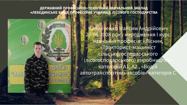 Калініченко Максим Андрійович 27.06.2008 року народження І курс навчання професія: «Лісник, «Тракторист-машиніст сільськогосподарського (лісогосподарського) виробництва» категорій А1, А2., «Водій автотранспортних засобів» категорія С