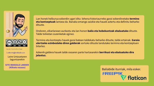 Lan honek helburua ezberdin ugari ditu: lehena historiaurreko garai ezberdinetako termino eta kontzeptuak lantzea da. Banaka emango zaizkie eta hauek aztertu eta definitu beharko dituzte. Ondoren, elkarlanean aurkeztu eta lan honen balio eta hobekuntzak ebaluatuko dituzte. Talde txikietan zuzenketak eginez. Termino eta kontzeptu hauek garai batean taldekatu beharko dituzte, talde ertainak. Garaia ulertzeko ezinbesteko diren galderak sortuko dituzte landutako termino eta kontzeptuen bitartez. Azkenik galdera hauek talde osoaren parte hartzearekin berrikusi eta ebaluatuko dira jolastuz.