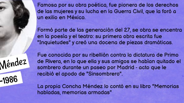 Famosa por su obra poética, fue pionera de los derechos de las mujeres y su lucha en la Guerra Civil, que la forò a un exilio en México. Formò parte de las generaciòn del 27, se obra se encentra en la poesìa y el teatro: su primera obra escrita fue "Inquietudes" y creò una docena de piezas dramàticas. Fue conocida por su ribelliòn contra la dictatura de Primo de Rivera, en lo que ella y sus amigos se habìan quitado el sombrero durante un paseo por Madrid - acto que le recibiò el apodo de "Sinsombrero". La propia Concha Méndez lo contò en su libro "Memorias habladas, memorias armadas"