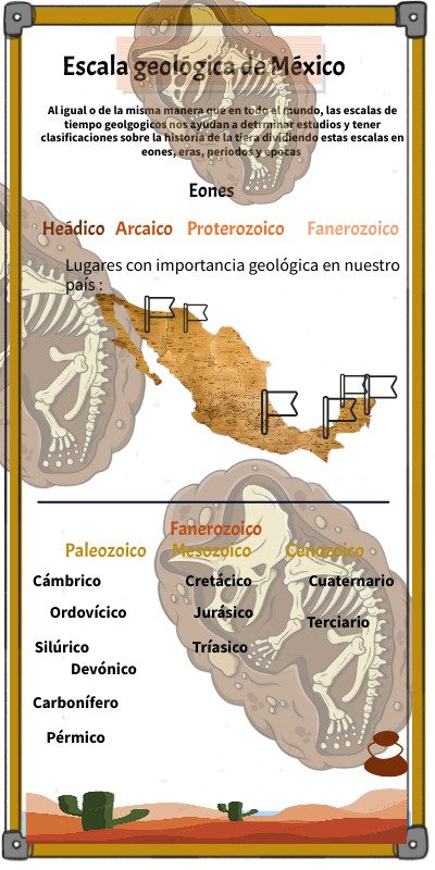 Al igual o de la misma manera que en todo el mundo, las escalas de tiempo geolgogicos nos ayudan a detrminar estudios y tener clasificaciones sobre la historia de la tiera dividiendo estas escalas en eones, eras, periodos y epocas