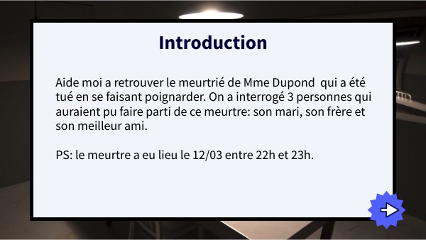 Nous arrivons a la fin du jeu il est temps trouver qui de ces 3 homme est le meurtrier. Tu vas devoir le choix avec les indices que tu as trouvé