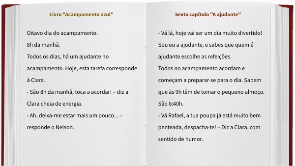 - Muito bem, ajudante Clara, e de certeza que todos vão gostar das tuas sugestões de refeições, sobretudo do jantar... – diz o monitor Pedro, enquanto lhe pisca o olho.