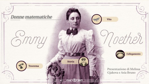 Amalie Emmy Noether (1882-1935) è stata una matematica tedesca. Si occupò di matematica, teoria degli anelli e algebra astratta e il suo nome è legato al teorema del 1915. Figlia primogenita del matematico Max Noether e di Ida Amalia Kaufmann, entrambi di origini ebraiche, nacque nella città bavarese di Erlangen. Noether non spiccava a scuola, nonostante fosse notoriamente intelligente. Le fu insegnato a pulire e a cucinare, e le furono impartite lezioni di pianoforte: non aveva passione per nessuna di queste attività. Dopo aver superato gli esami scelse matematica all'Università di Erlangen, dove il padre insegnava. Completata la tesi, lavorò all'Istituto di Matematica per sette anni, senza essere retribuita.