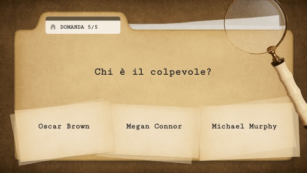 Il colpevole è Michael, padre Jacob si era accorto che lui stava cercando di rubargli io calice e per questo ha tenato di scappare ma lui lo ha raggiunto.Margaret é riuscita a scoprire che era stato Michael perché "Chi meglio di qualcuno che ha bisogno di soldi ruberebbe qaulcosa di costoso?" Io e Federico ti ringraziamo per averci aiutato a risolvere il caso, tieniti pronto per affrontare nuove avventure insieme!
