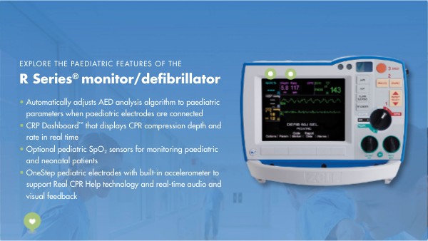• Automatically adjusts AED analysis algorithm to paediatric parameters when paediatric electrodes are connected • CRP Dashboard™ that displays CPR compression depth and rate in real time • Optional pediatric SpO2 sensors for monitoring paediatric and neonatal patients • OneStep pediatric electrodes with built-in accelerometer to support Real CPR Help technology and real-time audio and visual feedback