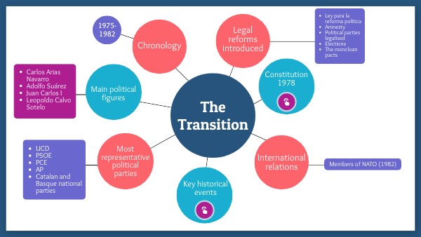 - Death of Francisco Franco (1975) - Juan Carlos I king of Spain (1975) - Adolfo Suárez as prime minister (1976) - First democratic elections (1977) - Moncloa Pacts (1977) - Constitution of 1978 - Resignation of Adolfo Suárez (29th January 1981) - Leopoldo Calvo Sotelo as prime minister (1981)