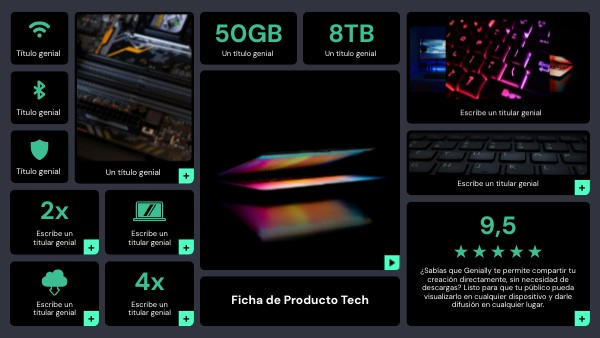 Crea gratis una ficha detallada de producto tecnológico para presentar las especificaciones, características y detalles de tus gadgets. Perfecta para análisis detallados e informativos de productos digitales, equipos y herramientas tecnológicas.