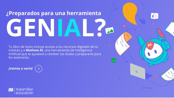 Tu libro de texto incluye acceso a los recursos digitales de tu módulo y a Mathew AI, una herramienta de Inteligencia Artificial que te ayudará a resolver las dudas y prepararte para los exámenes. ¡Vamos a verla!