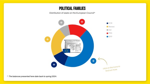 With a center-right tendency, the EPP brings together conservative political parties that favor a liberal market economy, conservative social policies, European integration, a strong Europe, and a reinforced external border. Greece, Poland, Luxembourg...