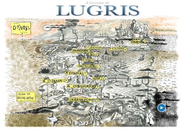 RÚA REAL No lugar que ocupa hoxe unha tenda Tiger, estivo o mural máis grande que fixo Lugrís. Orixinariamente foi feito para unha oficina bancaria que posteriormente convertiuse na cafetería Vechio. Hoxe en día atópase na OP de Abanca na Rúa Olmos.