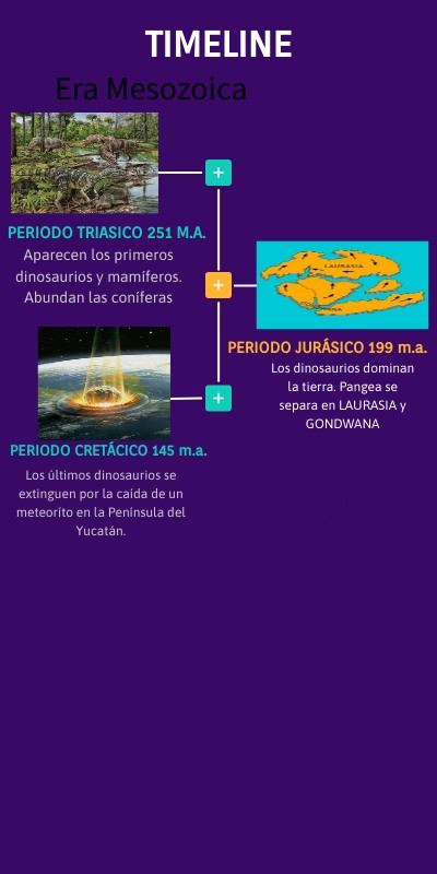 Los dinosaurios dominan la tierra. Pangea se separa en LAURASIA y GONDWANA