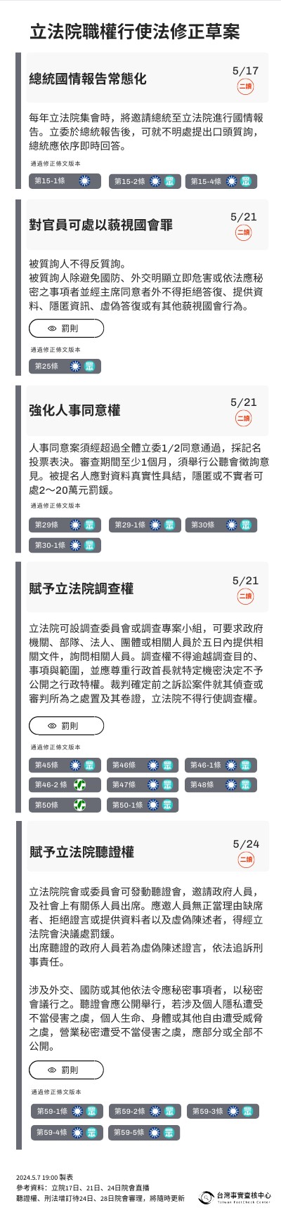 2024.5.28 18:00 製表參考資料:立院17日、21日、24日院會直播聽證權、刑法增訂待24日、28日院會審理,將隨時更新