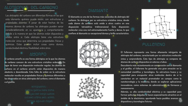 Las alotropías del carbono son diferentes formas en las que este elemento químico puede existir, con estructuras y propiedades distintas. A pesar de estar hechas de los mismos átomos de carbono, las alotropías pueden variar considerablemente en su apariencia y comportamiento debido a la manera en que los átomos están dispuestos y unidos entre sí. Cada alotropía tiene una estructura molecular única que determina sus propiedades físicas y químicas. Estas pueden incluir cosas como dureza, conductividad eléctrica, flexibilidad, entre otros.