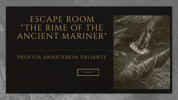 Siete pronti ad immergervi nell'emozionante mondo della poesia romantica inglese? Vi troverete catapultati nel cuore dell'epica avventura narrata nel celebre poema "The Rime of the Ancient Mariner" di Samuel Taylor Coleridge. Qui, l'antico marinaio vi attenderà per guidarvi attraverso una serie di enigmi e sfide che vi porteranno ad esplorare i misteri della sua travagliata odissea.Ma attenzione: il tempo è tiranno e il destino è nelle vostre mani. Dovrete dimostrare astuzia, cooperazione e ingegno per liberare l'antico marinaio dalla sua terribile maledizione e scoprire il segreto nascosto dietro le sue oscure vicende. Preparatevi a vivere un'esperienza indimenticabile, dove ogni indizio, ogni enigma e ogni passo vi avvicineranno sempre di più alla verità nascosta nel cuore di questo avvincente racconto poetico. Siete pronti a solcare i mari della vostra immaginazione e a sfidare il destino? Allora entrate e cominciamo questa straordinaria avventura insieme!